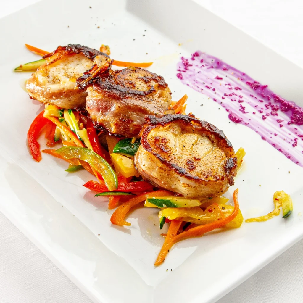 Seeteufel vom Grill mit Speck umwickelt auf Wok-Gemüse