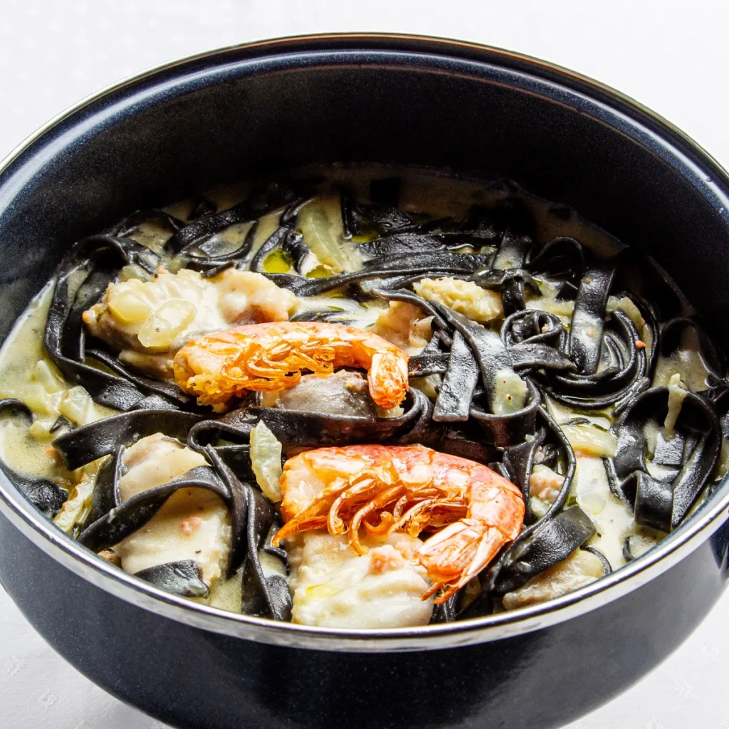 Seeteufel mit Garnelen und Fenchel auf Tintenfischnudeln