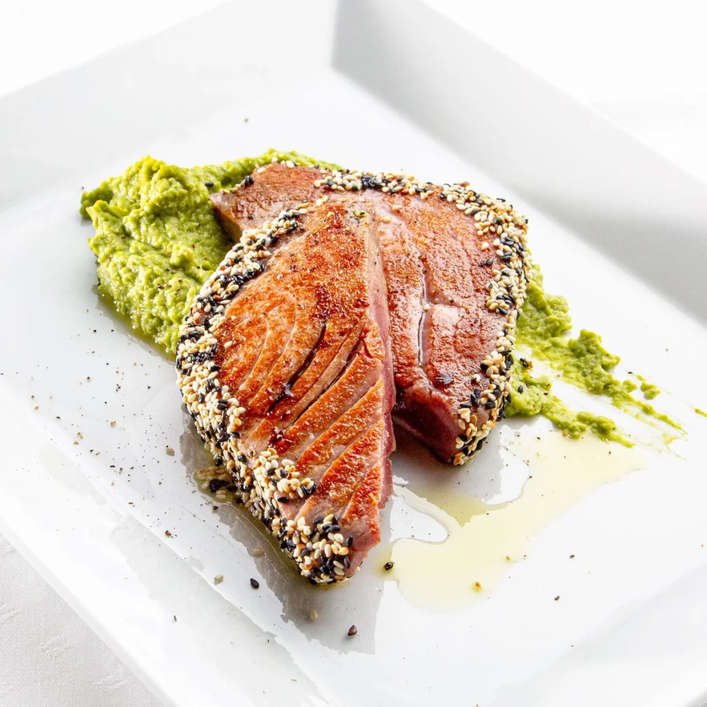 Thunfischsteak in Sesam und Leinsamen auf einer Erbsen-Minz-Creme