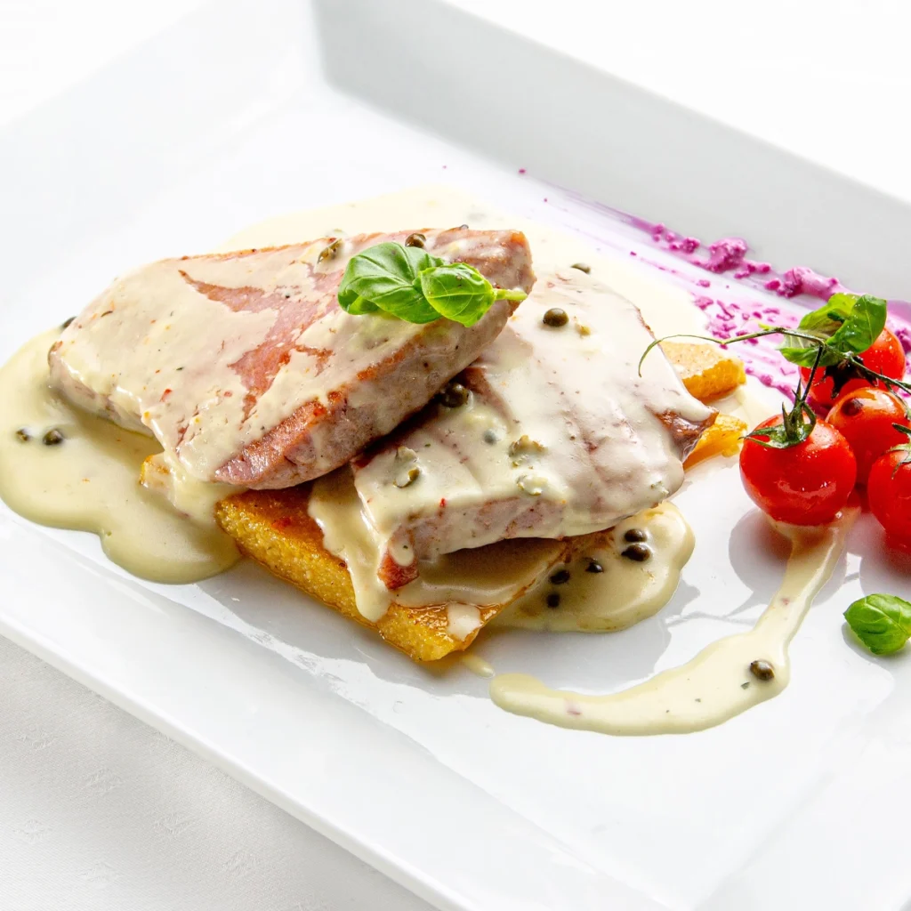 Thunfisch in grüner Pfeffersauce und Polenta mit getrockneten Tomaten