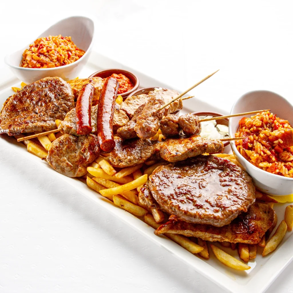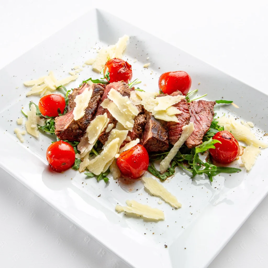 Tagliata di manzo con rucola e formaggio, pomodori ciliegini