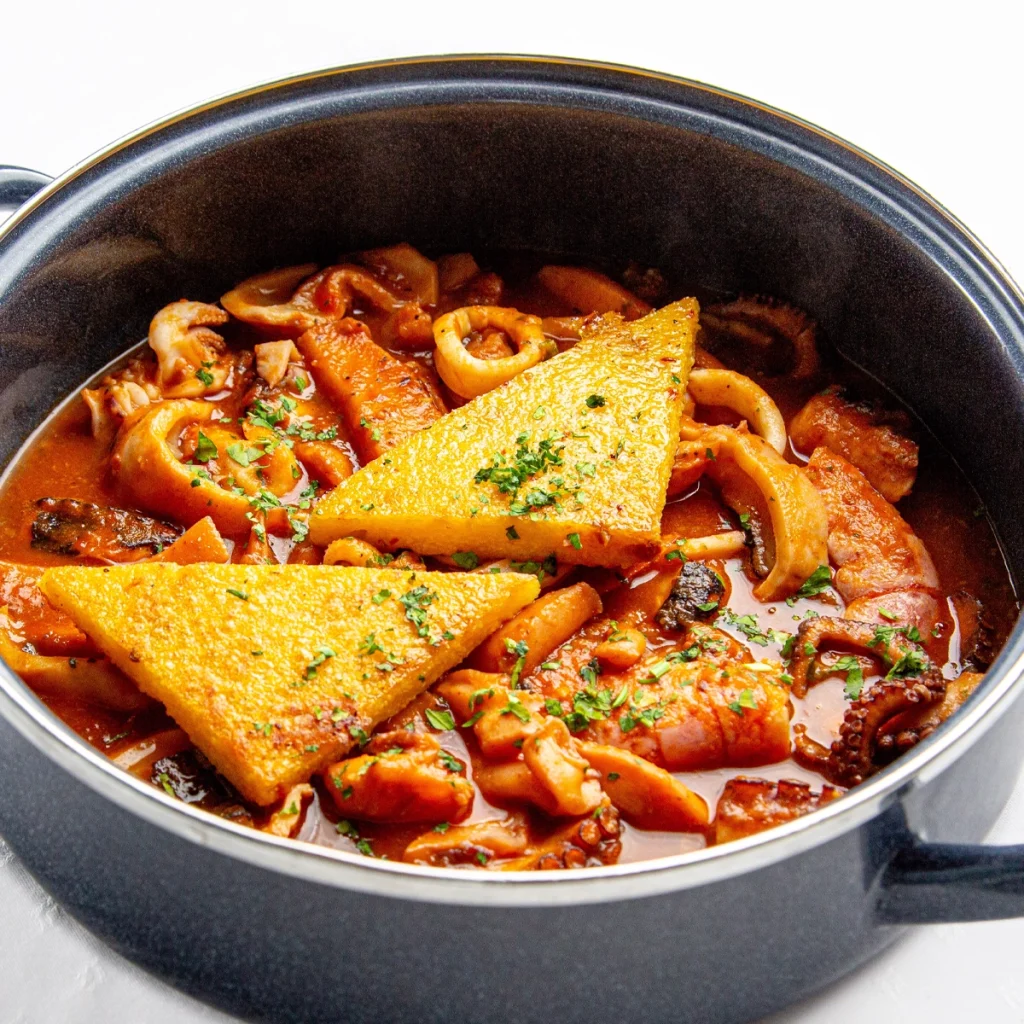 Brodet od hobotnice, sipe, lignji i kozica s palentom sa sušenim rajčicama